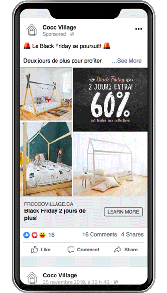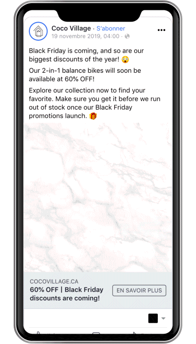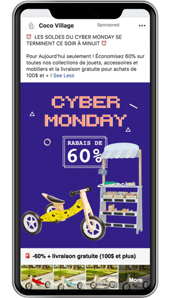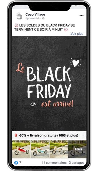 Afin de réchauffer nos futures audiences de Black Friday, nous avons utilisé quasiment 2 publicités par type de produit (ex. : vélo, lit, sac de couchage, etc.). Nous avons utilisé très souvent le duo carrousel/animation, de cette manière Facebook a toujours deux éléments à tester par audience.