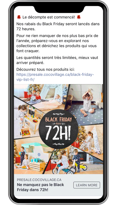 Avec notre audience chaude (les visiteurs n’ayant pas encore converti à la liste VIP), nous avons utilisé des publicités « décompte » pour créer un sentiment d’urgence. Pour rappel, les inscrits à la liste VIP avaient un accès anticipé de 48h et 60% de rabais avant le Black Friday.