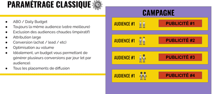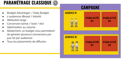 - Chaque audience a un budget qui lui est dédié (Adset Budget Optimization).