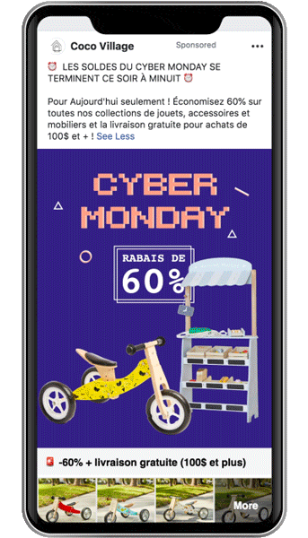 For Cyber Monday, we kept the same audience and campaign approach. Only the visuals and advertising messages have changed (see Part III. Creation).