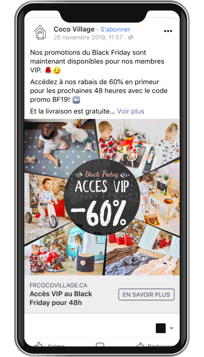 Online sales are not limited to Facebook. More and more, email marketing comes into play to trigger a purchase. That’s why we created a VIP list that offered its subscribers access to Black Friday promotions before everyone else. This lead is therefore twice as valuable as an opt-in competition. The person has signed-up to buy our products and expects to receive promotional emails.
