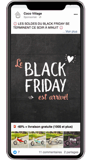 To warm up our future Black Friday audiences, we used almost two ads per product type (e.g. bicycle, bed, sleeping bag, etc.). We often used the carousel/animation duo, so that Facebook always had two elements to test per audience.