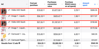 Generating a simple like or comment on the post cost 2.69 times more for the standard ad than the UGC video ad. Let's see what the spend and ROAS looks like at the account level now.