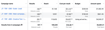To properly utilize ABOs to your advantage, here’s the structure we recommend: If you only have one “product” to promote, try launching a central campaign (with a large budget), and a smaller campaign to test new approaches that won’t directly compete with the former.