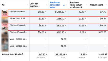Here are our retargeting ads that account for nearly 68% of the BOF campaign’s Purchase Value.