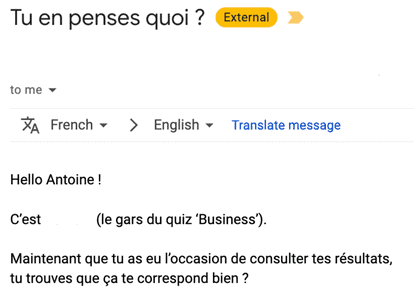 Hello Antoine! It’s [Client’s Name] (the guy from the Business Quiz). Now that you’ve had an opportunity to consult your results, what do you think?