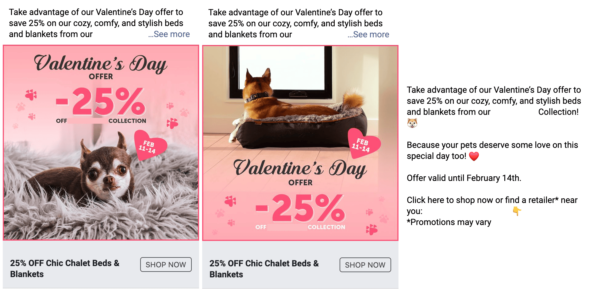Our Valentine’s Day ads were also successful for a client that sells pet products. We spent only $56 for a Flash Sale from February 11th to 14th, and our ROAS exploded by more than 150%.