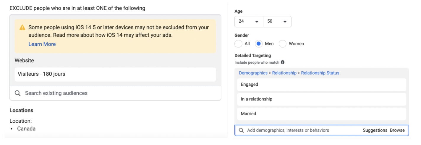 De cette façon, je touche ma clientèle : des hommes en couple qui ne sont jamais allés sur mon site en théorie. Donc, une audience froide qui ne me connaît probablement pas. Je pourrais même exclure les gens qui ont interagi avec ma page Facebook et Instagram pour être encore plus sûr.