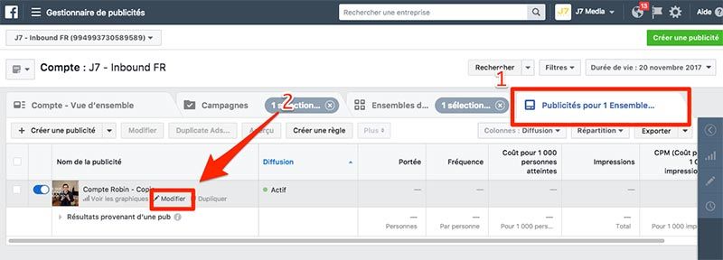 Pour ce faire, dans votre ensemble de publicités, vous devez :
